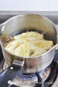 4. 炒勺内倒入花生油,中火烧至三成热时移到小火上,将折好的荷花沾均蛋泡糊,逐个下入油中炸制,用铁筷子轻轻拨动,炸至呈浅黄或黄白色时捞出,沥油;